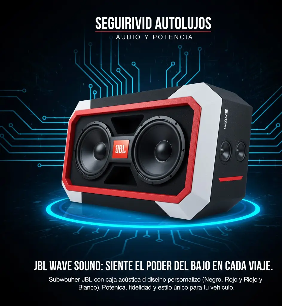 El JBL WAVE SOUND combina la potencia legendaria de JBL con un diseño de autolujo totalmente personalizado: una caja acústica audaz con acabados en negro, rojo y blanco. Este sistema está diseñado para ofrecer bajos profundos, resonantes y de alta fidelidad, garantizando que sientas cada nota de la música, mientras su estética única WAVE transforma tu vehículo en un verdadero espectáculo sonoro.